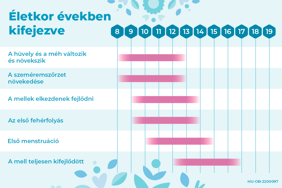 Az alábbi képen láthatod, mi történik a lányoknál a pubertáskorban . Láthatod, hogy viszonylag későn jön meg az első menstruációd a pubertás során. Előtte általában elkezd nőni a szeméremszőrzeted és a melleid, fehér folyásod lehet, és növekedési ugrást élsz át. Mire körülbelül 17 éves leszel, a tested teljesen kifejlődik. És teljesen normális, hogy minden lánynak kialakul a saját nőies formája - hiszen te vagy Te!